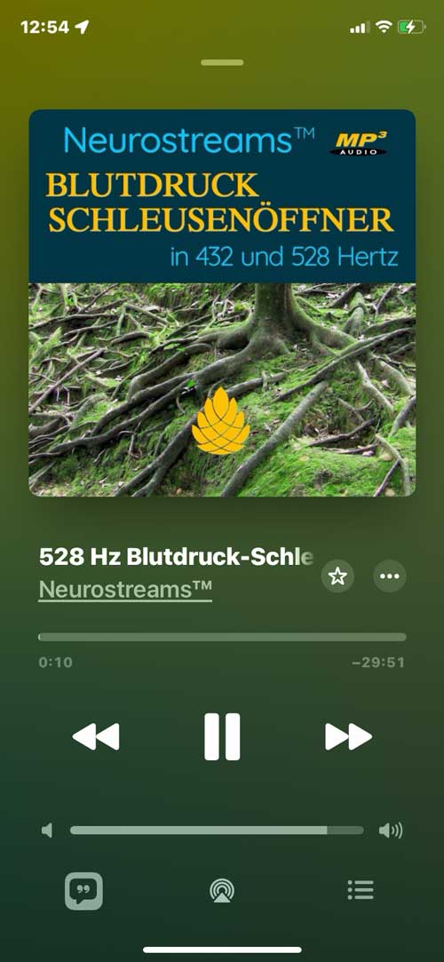 Habe eine Probe von der Musik zufällig im Net gefunden und angehört. Danach habe ich mich sehr wohl gefühlt. Kann mit diesem Produkt den Blutdruck um 20 mg/hg runter bringen. Außerdem bin ich im Kopf wieder freier und orientierter. Bin froh auf Ihre Produkte aufmerksam geworden zu sein. Damit konnte ich in meinem Fall Erleichterung erfahren und habe das Gefühl, selbst was tun zu können.